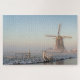 Rompecabezas de una fotografía de un molino de viento holandés tradicional con una cerca cubierta en nieve en un paisaje rural en los Países Bajos, en invierno en la luz de la madrugada en la salida del sol.