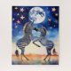 A romantic image with a fantasy feel of two zebra on their hind legs dancing under a big full moon with exaggerated illustrated stars in the night sky.