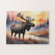 Esta serena pintura acuarela captura un majestuoso alce de pie elegante al amanecer, bañado en cálidos tonos dorados. Las suaves pinceladas y el ambiente nebuloso crean un ambiente tranquilo e inspirado en la naturaleza, perfecto para los amantes de la vida silvestre y el arte paisajístico.