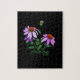 Una imagen distintiva de brotes y flores de conflor morado en un fondo oscuro. Hoy es más conocido el púrpura de la flor por su nombre latino "Echinacea"