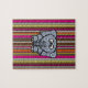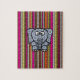 Un mosaico único del círculo concéntrico de un elefante con un fondo rayado en rosado, anaranjado, amarillo, magenta, y marrón.