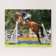 Diseño fotográfico de un caballo y jinete en una competencia de saltos.