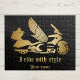 Golden motorcycle with wings fit for the most stylish riders and Goldwing enthusiasts! Add a personal touch with "i ride with style" and your name emblazoned on it.