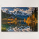 Una casa rústica al lado de un lago, con montañas cubiertas de nieve en el fondo, y álamos en plena gloria de otoño, crea un hermoso rompecabezas de rompecabezas. Perfecto para los amantes de la naturaleza y del exterior.
