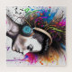 Esta es una imagen de arte digital de la cabeza de una mujer con auriculares encendidos. El fondo es blanco con salpicaduras de pintura colorida. Los auriculares son marrones. La imagen tiene un toque surrealista y artístico.