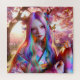 Mujer bonito rosa y morada con un efecto místico en un fondo etéreo de flores rosadas y mariposas. Su pelo parece un prisma de bonito.