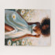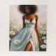 Este rompecabezas hiperfemenino presenta un retrato al óleo de una hermosa mujer negra relajada que lleva un vestido blanco de verano en un campo de margaritas.