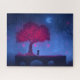 Un árbol rojo brillante en el bosque bajo la luz de la luna con un niño parado cerca, creando una atmósfera mística y mágica. Este es un gran diseño para los amantes del puzzle artístico y colorido.