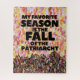 Bold feminist art print reading “My Favorite Season Is the Fall of the Patriarchy.” The design combines autumn colors with strong typography, featuring vivid orange, yellow, and pink watercolor brush strokes behind hand-drawn leaves in shades of red and gold. It celebrates empowerment, equality, and social change with a witty seasonal twist — perfect for activists, feminists, and anyone who loves fall and progress. My Favorite Season is the fall of the patriarchy autumn feminist feminism
