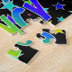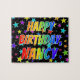 Este excitante y vibrante diseño de rompecabezas con temática de cumpleaños tiene el mensaje "FELIZ CUMPLEAÑOS, NANCY" con los personajes con un coloreado patrón de gradiente inspirado en el espectro de arcoiris, además de un divertido patrón de fondo de estrellas. Un acertado rompecabezas como este podría ser usado para enviar deseos de cumpleaños a alguien llamado Nancy. [~Z0000468]