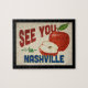 Un encantador rompecabezas de viaje vintage de Nashville Tennessee con una adorable manzana roja, junto con un divertido texto de estilo retro que dice, "Nos vemos en Nashville"