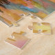 una acuarela decorativa de un barco de vela que se adentra en el océano bajo un colorido cielo atardecer con coloridas reflexiones en el agua como un rompecabezas de rompecabezas.