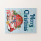 Este rompecabezas vacacional de Navidades personalizados presenta un bonito ilustracion personalizado de acuarela de una granja. Pequeños animales de granja están vestidos con sombreros de Santa en las afueras de una casa de campo. El fondo es de color azul claro.