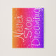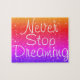 A colorful, positive affirmation to keep you focused on your goals. ‘Never stop dreaming’ is written in a handwriting-style font with a rainbow, star background.