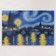 La paleta potencia el contraste dramático que caracteriza a Van Gogh: azules profundos y púrpuras se enfrentan a amarillos y blancos luminosos de estrellas y reflejos en el agua. La escena evoca una inmensidad cósmica y una profunda emoción, perfecta para los amantes del arte expresionista y los diseños con historia.
