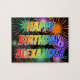 Este divertido y vibrante diseño de rompecabezas con temática de cumpleaños presenta el mensaje "FELIZ CUMPLEAÑOS, ALEXANDER", que tiene un colorido patrón de degradado inspirado en el espectro del arco iris, y un emocionante torbellino de fuegos artificiales de celebración inspirado en el patrón de fondo. Un puzzle vibrante como este podría ser una manera divertida de reconocer el cumpleaños de alguien llamado Alexander. [~Z0000465]