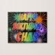 Este divertido y vibrante diseño de rompecabezas con temática de cumpleaños presenta el mensaje "FELIZ CUMPLEAÑOS, CHAD" con un colorido patrón de gradiente inspirado en el espectro del arcoiris, y un animado estallido de fuegos artificiales de celebración inspirado en el patrón de fondo. Un rompecabezas vibrante como este podría ser una manera divertida de reconocer el cumpleaños de alguien llamado Chad. [~Z0000465]