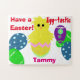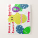 Mi Diseño Digital Original De Arte Gráfico Pintado A Mano. Rompecabezas personalizadas únicas para los chicas mostrados en un fondo blanco. Con la redacción en rojo, morado y rosa, ten un NOMBRE de Pascua delicioso para los huevos. Personalizar con el nombre del niño mostrado en texto rosa. Patata de bebé amarilla en sus rayas rosadas de huevo y verde claro y la apariencia de rociadas coloridas en su vientre. Los huevos de Pascua decorados con bonito están en su camino en puntos de polka azul, huevo rayado verde y huevo púrpura de bonito con flor verde y flor de desplazamiento blanco. Diseñado para un fondo blanco. El rompecabezas de Pascua Divertida hace un buen regalo para los niños, compañeros de clase fiesta de Pascua y una buena idea de la Cesta de Pascua. Obra de arte y diseño originales © 2013 TamiraZDesigns.