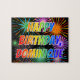 Este animado y divertido diseño de rompecabezas con temática de cumpleaños presenta el mensaje "FELIZ CUMPLEAÑOS, DOMINIQUE" con un colorido patrón de gradiente inspirado en el espectro de arcoiris, y un emocionante y reventado patrón de fondo inspirado en fuegos artificiales de celebración. Un acertado rompecabezas como este podría ser una manera divertida de enviar deseos de cumpleaños a alguien llamado Dominique. [~Z0000465]