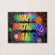 Este divertido y emocionante diseño de rompecabezas con temática de cumpleaños presenta el mensaje "FELIZ CUMPLEAÑOS, JANET", con un colorido patrón de gradiente inspirado en el espectro de arcoiris, y un animado estallido de fuegos artificiales de celebración inspirado en el patrón de fondo. Un acertado rompecabezas como este podría ser usado para enviar un mensaje de bienvenida de cumpleaños a alguien llamado Janet. [~Z0000465]