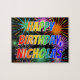 Este emocionante y animado diseño de rompecabezas con temática de cumpleaños tiene el mensaje "FELIZ CUMPLEAÑOS, NICHOLAS" con un colorido patrón de gradiente inspirado en el espectro de arcoiris, y un vibrante patrón inspirado en fuegos artificiales de celebración. Un rompecabezas vibrante como este podría ser una manera divertida de reconocer el cumpleaños de alguien llamado Nicholas. [~Z0000465]