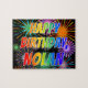 Este vibrante y emocionante diseño de rompecabezas con temática de cumpleaños presenta el mensaje "FELIZ CUMPLEAÑOS, NOLAN" con un colorido patrón de gradiente inspirado en el espectro del arcoiris, y un animado estallido de fuegos artificiales de celebración inspirado en el patrón de fondo. Un rompecabezas vibrante como este podría ser usado para enviar un mensaje de bienvenida de cumpleaños a alguien llamado Nolan. [~Z0000465]