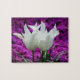 Un pequeño rompecabezas de 2 tulipanes blancos sobre un fondo florido fushia.