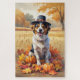 Una pintura acuarela de un perro alegre sentado en medio de un montón de hojas caídas vibrantes, rodeado de pequeñas calabazas y bellotas dispersas. El perro lleva un pequeño gorra peregrino y vigas de alegría, capturando el espíritu del Día de Acción de Gracias. Como telón de fondo, los campos de suave cosecha y los árboles de tonos dorados crean un ambiente campestre tranquilo. Las texturas suaves y los tonos cálidos y mudos del otoño le dan al lugar un ambiente acogedor y nostálgico, perfecto para celebrar la belleza de la temporada.