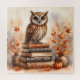 El rompecabezas presenta obras de arte de acuarela aviaria de otoño de un pequeño búho encaramado en una pila de libros en temporada de otoño, rodeado de decoración otoñal que incluye calabaza y hojas. El diseño está en un esquema de colores cálidos que incluye naranjas, browns y neutrales. ¡Genial para los amantes de la lechuza y los bibliófilos!