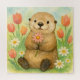Un ilustracion acuático de una divertida nutria marina con una flor rosada de margarita, con tulipanes de primavera y margaritas blancas a su alrededor