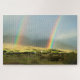 Un paisaje rural con montañas y un doble arco iris delante de ellos. Los arcos de lluvia son resaltados por la luz del sol en un paisaje que por lo demás está invadido.