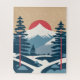 Un encantador ilustracion minimalista de un paisaje invernal con caída de nieve, pinos, montañas y amanecer. ¡Genial para coleccionistas de rompecabezas!