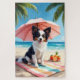 A delicate Papillon enjoying a bright beach setting with tropical fruits and ocean views. The painterly style creates a soft and cheerful coastal vibe.