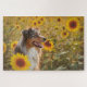 El rompecabezas colorido muestra la fotografía del perro pastor australiano en un campo de girasoles florecientes.