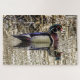 pato macho de madera brillante y colorido nadando entre unas cañas en un estanque