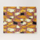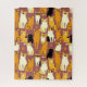 Rompecabezas en un patrón juguetón de gatos estilizados en tonos cálidos de jengibre, crema, negro y marrón sobre un fondo marrón caramelo. Cada gato tiene su propia expresión y marcas bonitas, con pequeñas huellas de pata dispersas por todas partes.