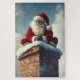 La imagen muestra a Santa Claus sentado sobre una chimenea de ladrillo cubierta de nieve, vestido con su icónico traje rojo con guarnecido de piel blanca y un gorra rojo. Él sonríe cálidamente, sus manos engullidas se aferran a las manos, mientras la nieve cae suavemente a su alrededor. En el fondo, un cielo suave y invernal con nubes claras realza el ambiente festivo y mágico de la escena.