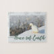 Adorable foto de un pato blanco junto con patos mallard en el agua helada con la cita Paz en la Tierra en una moderna letra de escritura. Este rompecabezas tiene una capa de copo de nieve suave y húmeda, un regalo perfecto para los amantes de la naturaleza.