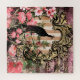 Rompecabezas con la elegante pintura v"de pintura de un pavo real, un marco dorado y hermosas flores rosadas sobre un fondo de partitura antigua.