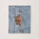 Un hámster sirio de pelo largo asoma al bolsillo trasero de unos vaqueros azules denim