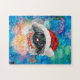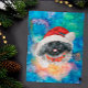 Pekinés raza perro Navidad presenta una acuarela de un Pekinés con un sombrero rojo de Santa, un collar de Navidad rojo y una acuarela de galaxia.