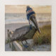 A pelican perched on a beach fence wears a winter hat and vest, set against a serene backdrop of gentle ocean waves and a soft sky
