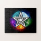 Pentagrama luminoso de dibujo artístico con cinco elementos mágicos, agua, tierra, fuego, astral, aire sobre fondo negro. Pentagrama de Wiccan. Wicca