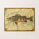 Esta impresión ilustra una imagen artística de un pez perca amarillo. El fondo muestra un mapa geográfico vintage en tonos beige claro. El marco marrón se asemeja al antiguo patrón de madera con flores amarillas-rojas en los bordes. ¡Una gran adición a tu colección de pesca!
