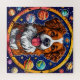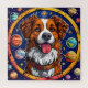 Perro alegre de piel marrón y blanca, destacado en un ambiente vibrante del espacio exterior. El perro está centrado en un marco circular decorado con planetas coloridos, estrellas y otros elementos celestes. Su lengua está fuera, y tiene una expresión feliz, dándole una personalidad lúdica. La combinación del perro con el tema cósmico crea un ambiente caprichoso e imaginativo. Los colores son audaces y luminosos, lo que realza el ambiente alegre del ilustracion.