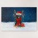 El perro de Terranova en la nieve con sombrero de Santa y regalos de Navidades es una idea de regalo perfecta para Navidades para alguien que ama esta raza de perro.