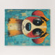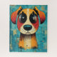 Este diseño presenta un ilustracion de perro colorido con ojos grandes e inocentes. Este diseño tiene un fondo azul y es una gran elección para los amantes del perro.