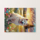 Perro Samoyedo sentado en un prado de flores. Rompecabezas, planificadores, cuadernos con este diseño en mis tiendas.. Muchos diseños de mascotas y paisajes en mis tiendas. Agrega este diseño a otros productos. Agregar texto.
