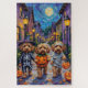 Adorables Cockapoos vestidos con disfraces divertidos de Halloween llevan cubos de calabaza mientras piden dulces bajo el cielo iluminado por la luna. Este diseño festivo destaca el pelaje esponjoso de la raza, su naturaleza afectuosa y personalidad alegre, capturando perfectamente la atmósfera espeluznante pero divertida de la noche de Halloween. Una encantadora celebración para los amantes de los perros y los fanáticos de Halloween por igual.