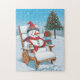Una pieza que une la alegría del invierno con este encantador rompecabezas con un muñeco de nieve de contenido sentado tranquilamente afuera, irradiando una sensación de relajación y alegría navideña.